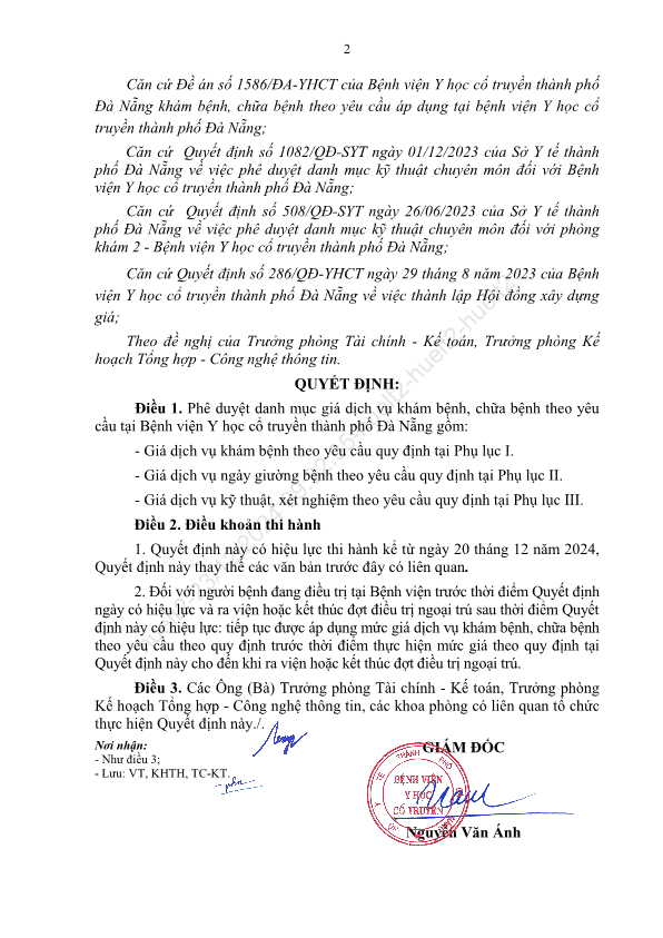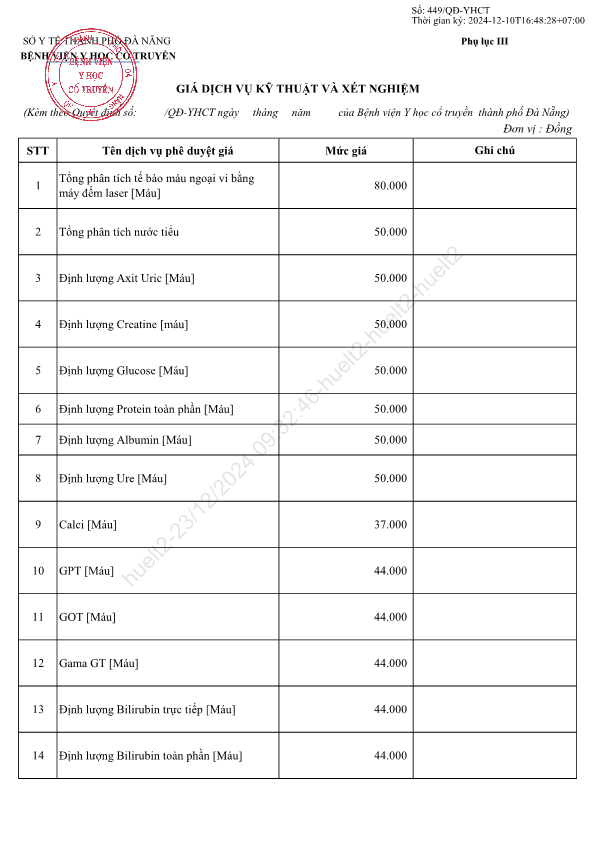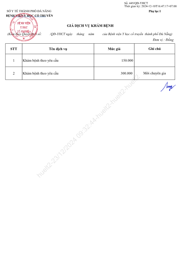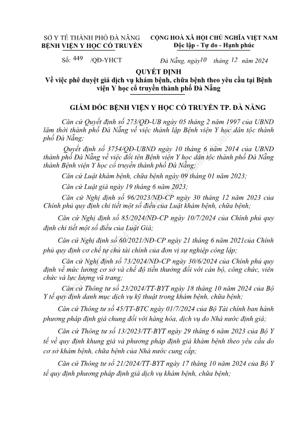 QĐ-YHCT 449/ VỀ VIỆC PHÊ DUYỆT GIÁ DỊCH VỤ KHÁM BỆNH, CHỮA BỆNH THEO YÊU CẦU TẠI BỆNH VIỆN Y HỌC CỔ TRUYỀN THÀNH PHỐ ĐÀ NẴNG