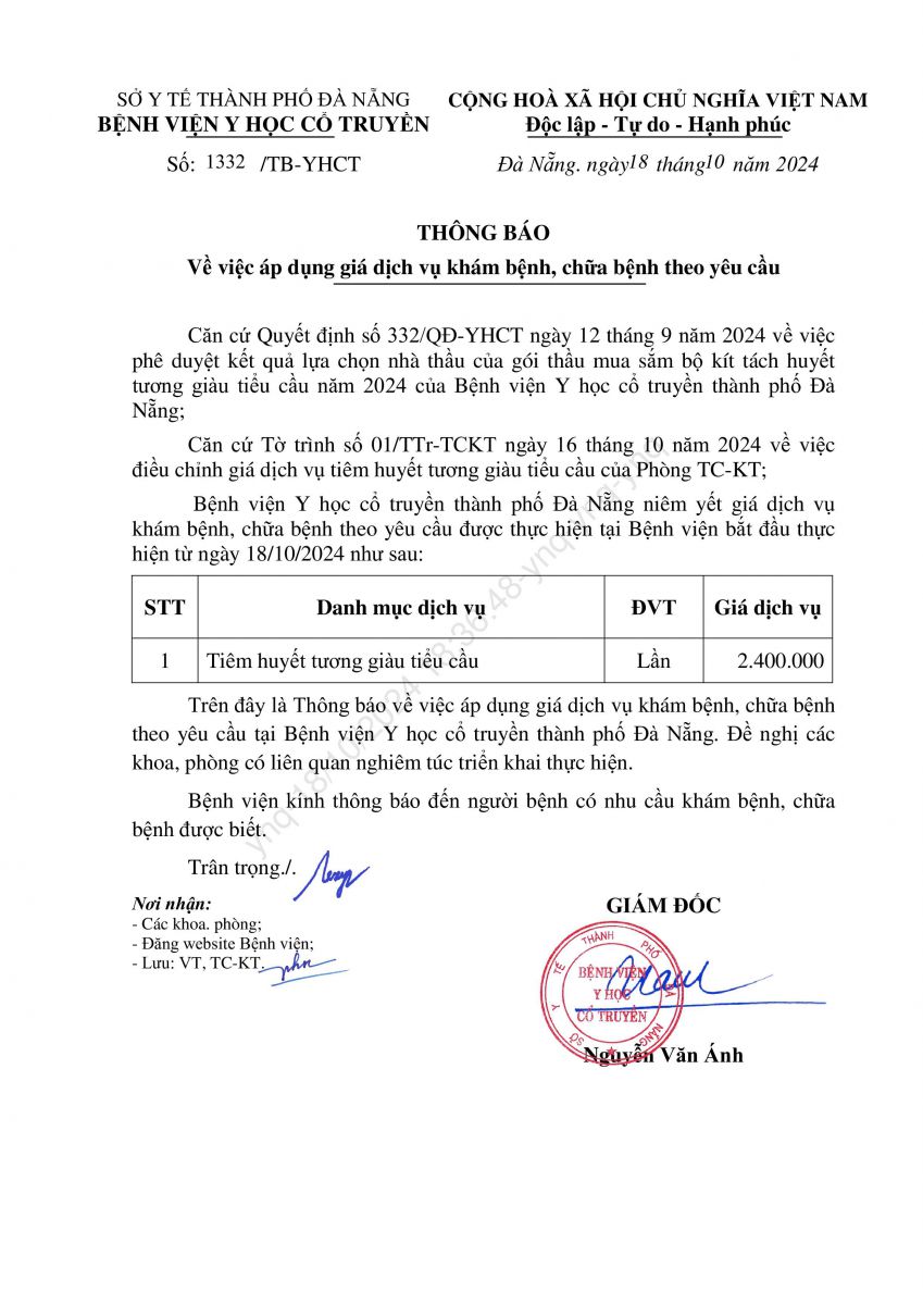 TB 1332 VỀ VIỆC ÁP DỤNG GIÁ DỊCH VỤ KHÁM BỆNH, CHỮA BỆNH THEO YÊU CẦU
