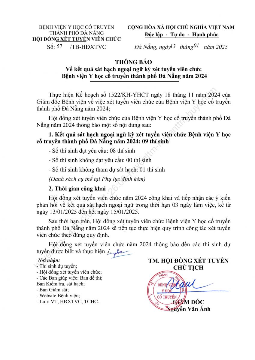 TB57/ VỀ KẾT QUẢ SÁT HẠCH NGOẠI NGỮ KỲ XÉT TUYỂN VIÊN CHỨC BỆNH VIỆN Y HỌC CỔ TRUYỀN THÀNH PHỐ ĐÀ NẴNG NĂM 2024