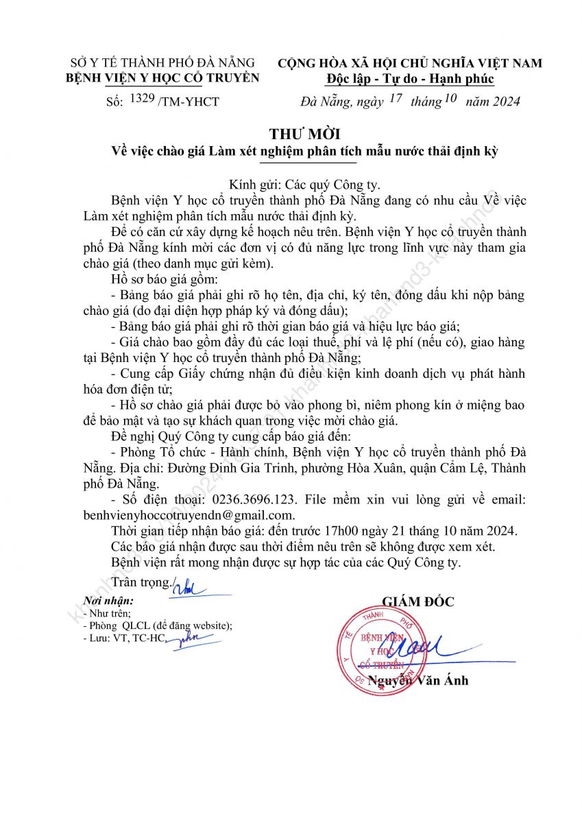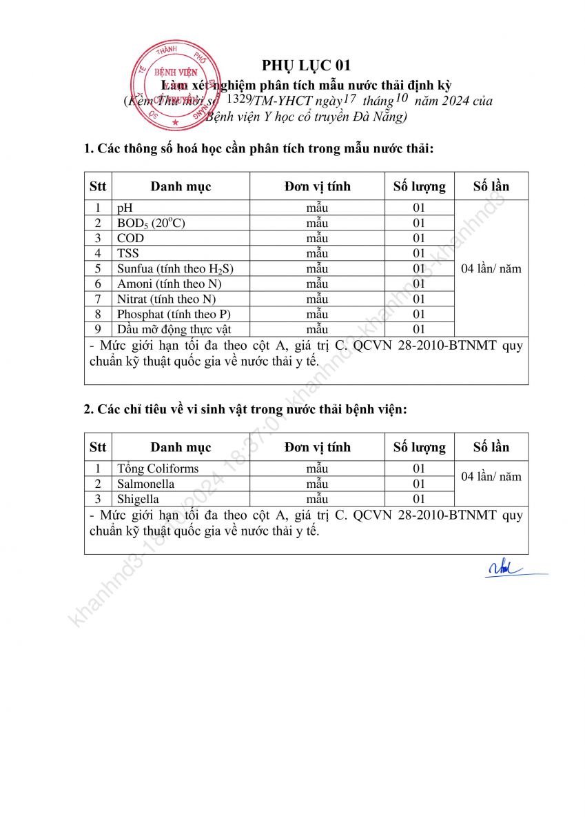 TM 1329/ VỀ VIỆC CHÀO GIÁ LÀM XÉT NGHIỆM PHÂN TÍCH MẪU NƯỚC THẢI ĐỊNH KỲ