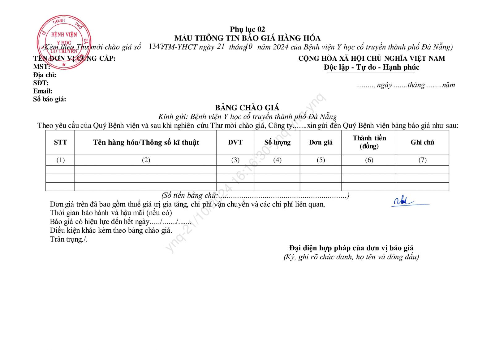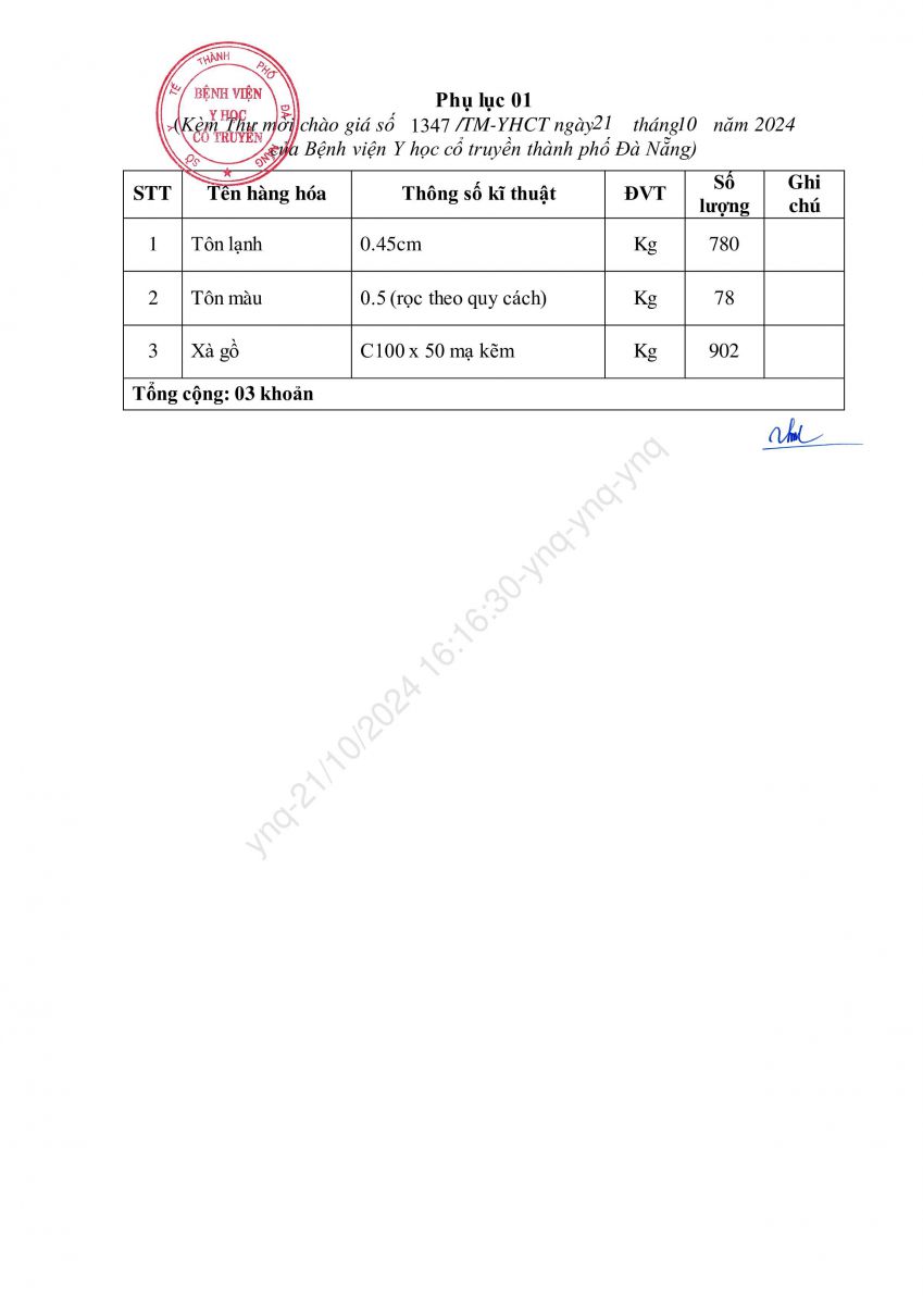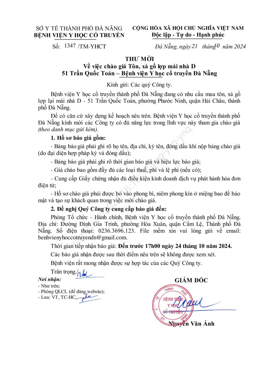 TM 1347 VỀ VIỆC CHÀO GIÁ TÔN, XÀ GỒ LỢP MÁI NHÀ D 51 TRẦN QUỐC TOẢN – BỆNH VIỆN Y HỌC CỔ TRUYỀN ĐÀ NẴNG
