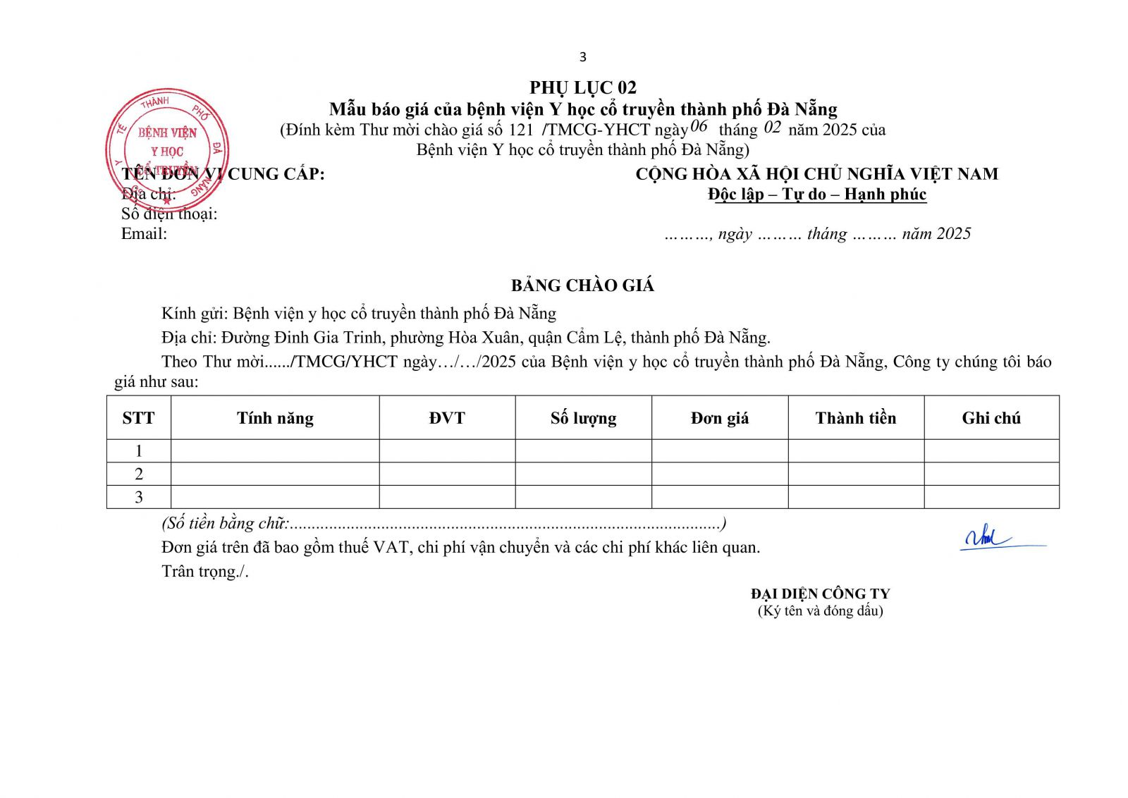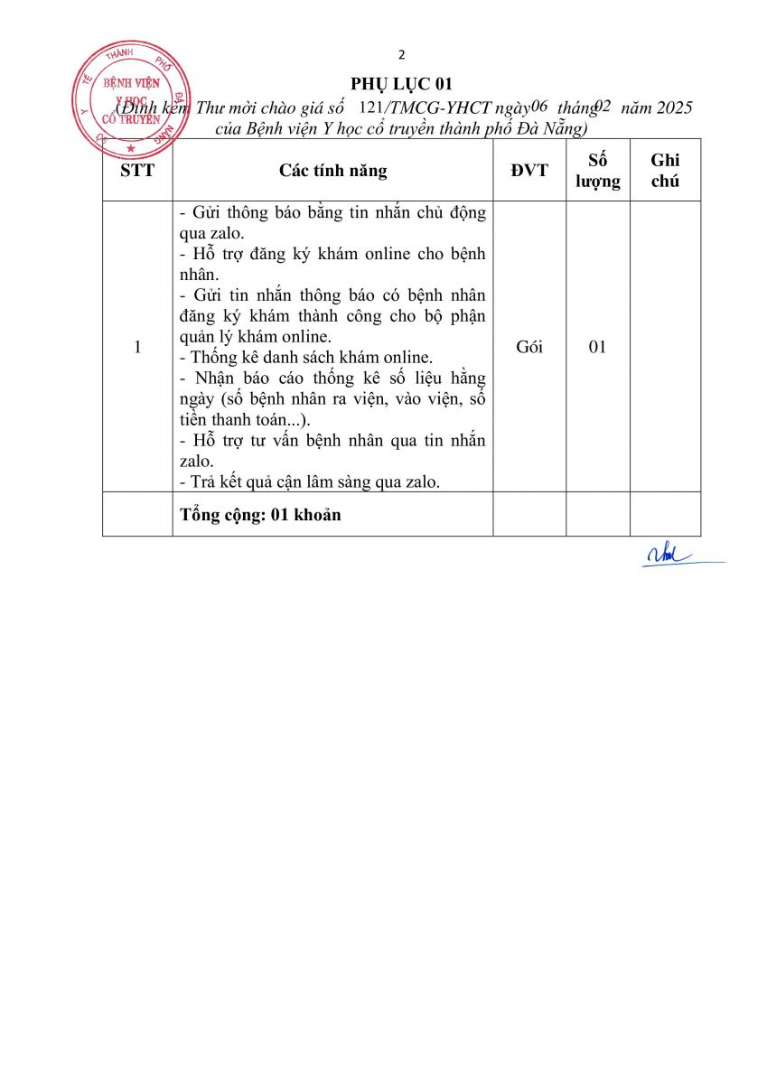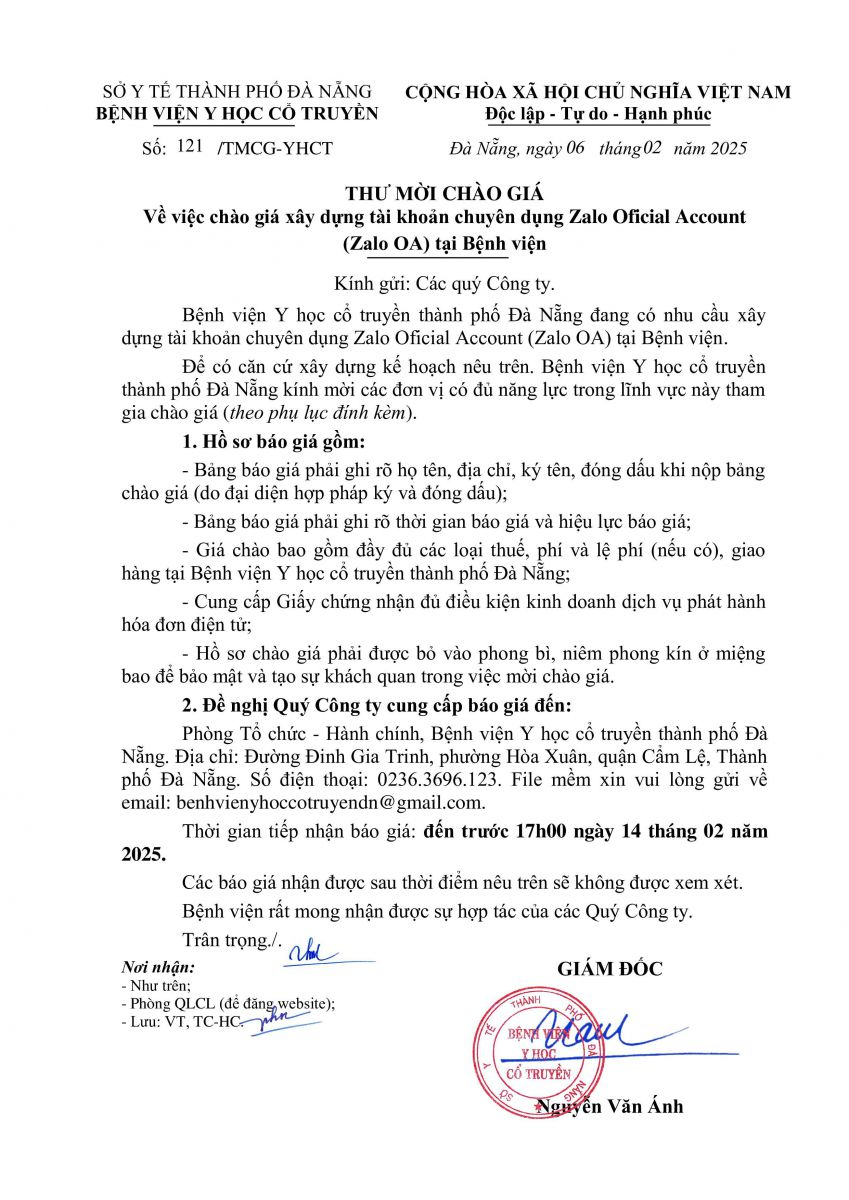 TMCG121/ VỀ VIỆC CHÀO GIÁ XÂY DỰNG TÀI KHOẢN CHUYÊN DỤNG ZALO OFICIAL ACCOUNT (ZALO OA) TẠI BỆNH VIỆN