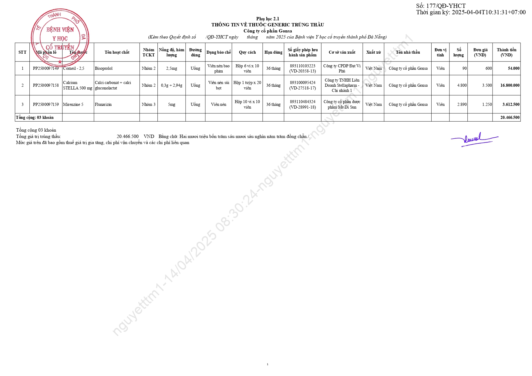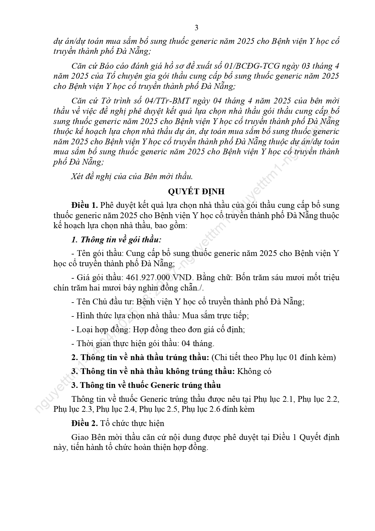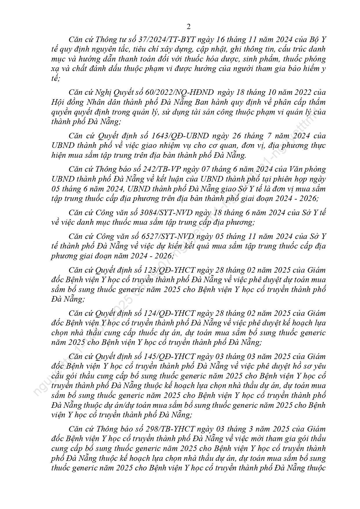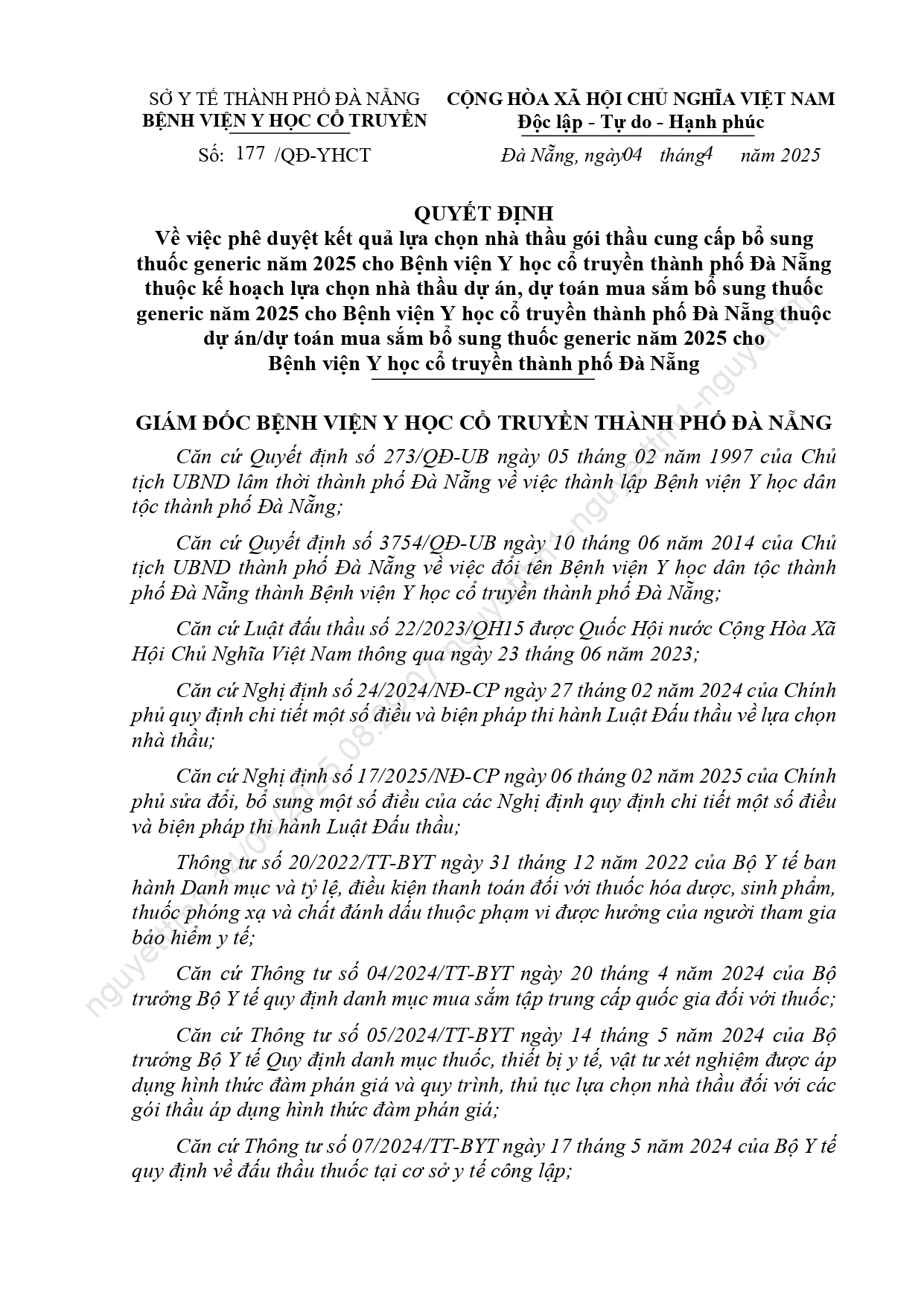 VỀ VIỆC PHÊ DUYỆT KẾT QUẢ LỰA CHỌN NHÀ THẦU GÓI THẦU CUNG CẤP BỔ SUNG THUỐC GENERIC NĂM 2025 CHO BỆNH VIỆN Y HỌC CỔ TRUYỀN THÀNH PHỐ ĐÀ NẴNG THUỘC KẾ HOẠCH LỰA CHỌN NHÀ THẦU DỰ ÁN, DỰ TOÁN MUA SẮM BỔ SUNG THUỐC GENERIC NĂM 2025 CHO BỆNH VIỆN Y HỌC CỔ TRUYỀN THÀNH PHỐ ĐÀ NẴNG THUỘC DỰ ÁN/DỰ TOÁN MUA SẮM BỔ SUNG THUỐC GENERIC NĂM 2025
